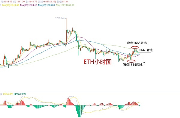 10月7日以太坊(ETH)合约技术面分析:今日方面,大周期日线级别昨日报收小阳线,K线形态上连阴单阳,价格在均线下方,附图指标多头缩量运行,快慢线有粘合死叉迹象,虽说价格没有出现较大的跌幅,但是整体趋势偏向下跌明显,且反抽是看不到力度的,所以大趋势上还是空;短周期小时图前一日美盘价格支撑反弹,且破位前一日高点位置,今日早间承压回撤,加上时间在周末,那么今日我们要看震荡,当前K线形态连阴,附图指标死叉运行,这样来看日内是有回撤修正需求的,需要关注的是力度大小,因此今日ETH短线合约交易策略:现价1645直接空,止损1665区域,目标看1620-1615区域,回撤1615区域多,止损1600区域,目标看1640-1645区域
