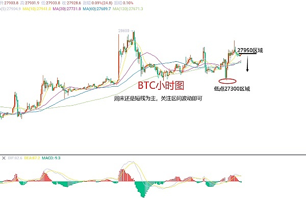 10月7日比特币(BTC)合约技术面分析:今日方面,大周期日线级别昨日报收中阳线,K线形态上单阴单阳,价格还是没有太大变化,跌一天,涨一天来回洗盘的节奏,附图指标多头缩量,但是下跌的延续性和价格都难有爆发,这样来说近期的走势还是要先看区间震荡了,交易也还是短线为主;短周期小时图昨日美盘前价格回撤,低点27150区域附近,美盘支撑反弹且破位了前一日的高点位置,今日早间承压回撤,承压位置28300区域附近,当前K线形态连阴,附图指标死叉,日内是有回撤修正的需求,需要关注的是回撤修正的力度,因此今日BTC短线合约交易策略:现价27950直接空,止损28150区域,目标看27650-27500区域;回撤27500区域多,止损27300区域,目标看28000区域;