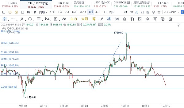 行情就是这么极端,晚间超跌过后大饼和以太纷纷迎来反抽,向上拉升的力度强势,震荡上行高点不断上移。大饼在28450位置插针,现在回调在27900附近;以太高点1665点附近,早间回踩1640平台。正常逻辑去看这次拉升,以太其实处于不理性上涨,没有连续性,小时线触碰MA450均线后回落,调整的幅度有20多点,KDJ和MACD指标全部是死叉形态,空头量能柱出现。建议以太1645—1650空,目标1625—1615,破位看1600附近。