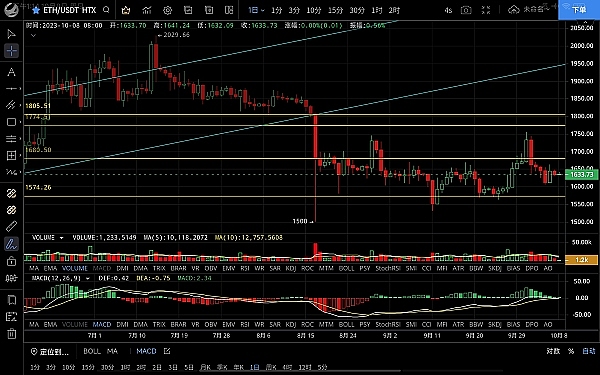 以太坊昨日高位触及1662一线迅速回落,白盘呈震荡下行走势,低位跌至1630一线支撑反弹,目前币价在1639附近运行,四小时级别行情冲高回落后未延续空头走势,k线连阳,macd多头运行双线金叉状态,若行情站稳1640上方则有继续冲高的可能,日线级别k线收上影线,ma7拐头向下指引,macd多头逐步缩量双线粘合有死叉迹象,短期走势偏向回调,整体依旧是区间震荡,思路建议高空低多对待,上方压制1640-1660,下方支撑1620-1600