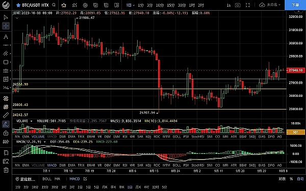 大饼昨日早间上攻至28281一线受阻回落,白盘整体呈震荡走势波动不大,目前币价在28060附近运行,四小时级别行情重新回到ma7上方运行,macd多头运行双线金叉状态,前面行情二次下探未破前低插针后迅速反弹足以说明下方支撑较为强劲,空头下跌力度不足,短期走势偏向多头,日线来看行情整体沿ma7一路上涨很明显的多头趋势,若站稳28300上方则还有高点,目前走势多空都不适合入场。等待拉升至阻力区域后做高空,上方压制28500-29000,下方支撑27800-27500