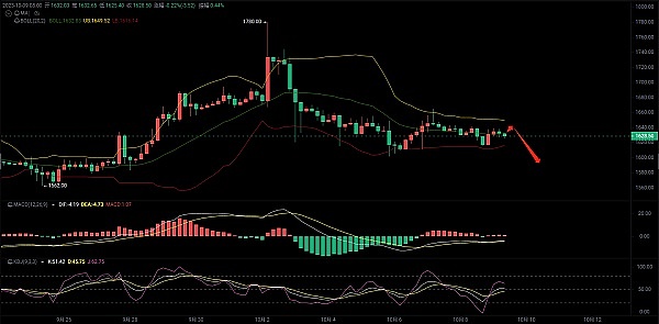 1小时图来看,BOLL布林通道上轨缓慢缩口,K线多次下探受阻未能攻破1600反弹至1630附近运行,MACD多头能量住开始缩量,KDJ三线向下发散,4小时图来看,布林带上轨向下收口,币价运行至中轨下方,附图MACD粘合多头能量放量乏力,KDJ死叉向下。东哥建议以高空为主。