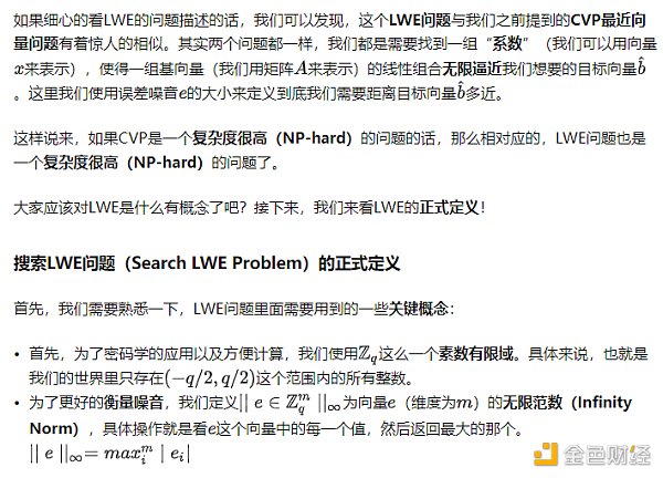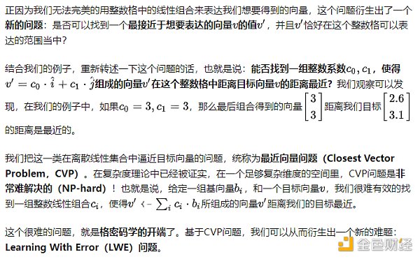 PS:格密码学中还有另一个难题叫SVP问题(Shortest Vector Problem),和CVP不同,但也是NP-hard的问题。我们在这里就不多解释了。