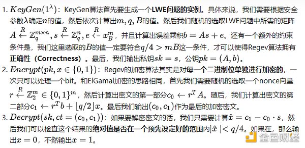 Regev加密是一个叫Regev的大佬在2005年发明出来的,是一个非常类似于ElGamal类型的公钥加密系统,基于了DLWE的假设。我们来看看它的具体定义吧: