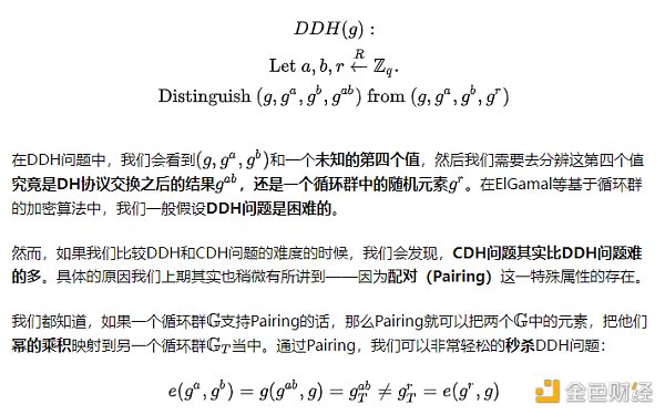 DDH假设其实非常的不完美,甚至于令人头疼。因为Pairing这个后门的存在,这直接给DDH问题设置了一个惊人的困难度下限——在Pairing存在的组中,DDH问题太简单了。所以我们在挑选群的时候,一定要精心挑选。DDH的大哥CDH却不一样,因为没有任何高效率的算法可以破解离散对数,所以在任何循环群中的复杂度都较为平均。这样一来,CDH就算再困难,对于DDH的困难度分布也没有太多实质性的帮助。我们往往需要使用平均困难度来定义DDH问题的困难度(因为下限太低了)。这在密码学中是一件非常膈应人的事情,就像是我送给你一辆车,但是告诉你这个车,有一定的可能性会一开就自动散架一样。