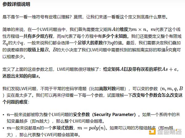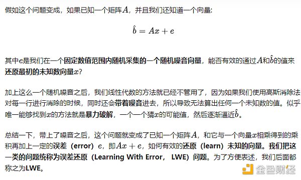 首先,我们一起看到了整数格(Integer Lattice)的定义,然后基于整数格了解了NP-hard的最近向量问题( CVP)。随后,我们重新回顾了高中时期学习的求解线性方程组问题,并且统一归纳为高斯消除问题。随后,我们给高斯消除问题本身加入了一个随机的误差噪音,从而构成了我们的主角,误差还原(LWE)问题。