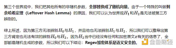 为了证明Regev加密体系是语义安全的,我们需要使用密码学中的一种常见的证明工具:混合论证法(Hybrid Argument)。混合论证其实并不是什么黑科技,而是我们把要证明的问题划分成若干小步,然后逐步证明罢了。