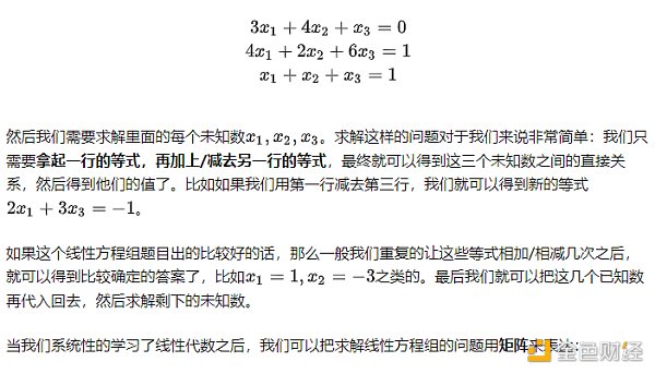 我们在初中或者高中的数学课上应该都学过如何求解线性方程组(solve system of equations)。一般来说,我们会给到一组多元一次方程: