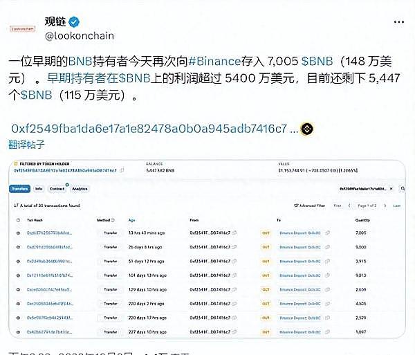 首先,截至10月8日,一位早期持有者将其价值148万美元的BNB成功出售给币安,据悉,此次交易使得该投资者获得高达5400万美元的利润。这位投资者自2018年起就一直持有BNB,并在首次抛售时赚得5600万美元。尽管这次出售并没有对BNB价格造成显著影响,但作为小散户,我们仍需谨慎对待。