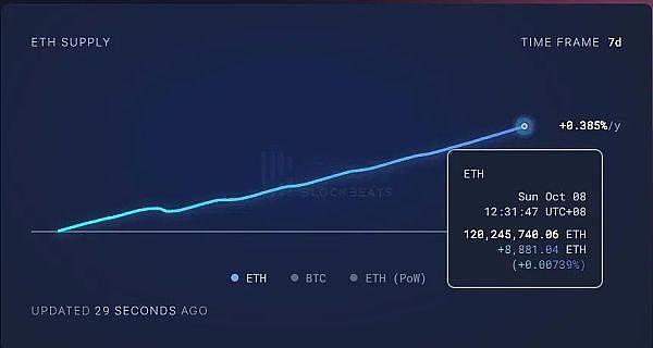 以太坊的年通胀率已经上升至0.385%,在过去的7天内通胀了8881.04枚