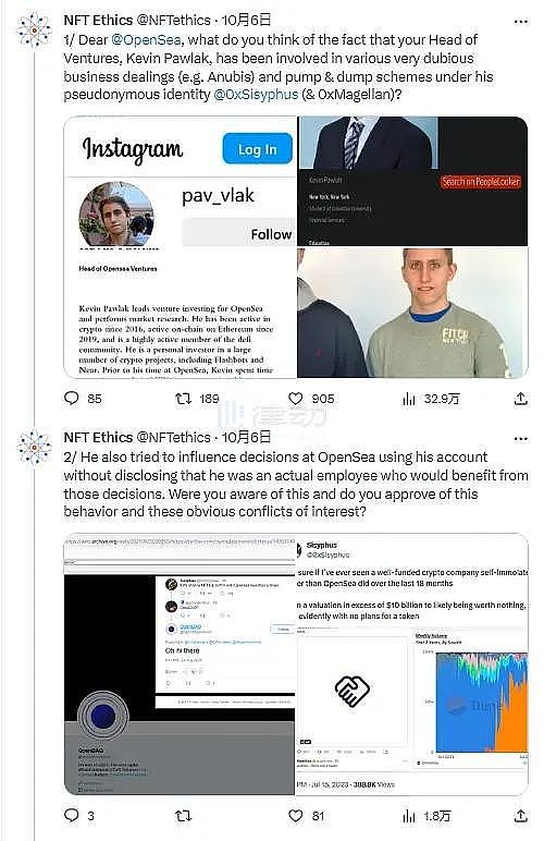 NFT Ethics在社交平台上发布文章,披露了Sisyphus的真实身份,指向了OpenSea风投主管Kevin Pawlak。据称,Sisyphus曾参与各种可疑的商业交易,比如与Anubis相关的,还涉及哄抬物价。此外,Sisyphus试图通过私人账户来影响OpenSea的决策,曾与Alameda Research交流并告知他们购买Anubis(ANKH)。NFT Ethics的调查表明,Sisyphus&Co在Anubis事件中可能是有预谋的Rug Pull,随后通过PEPE进行洗钱。