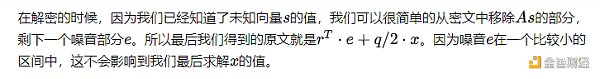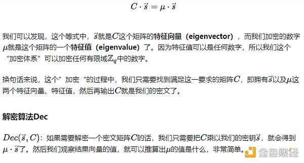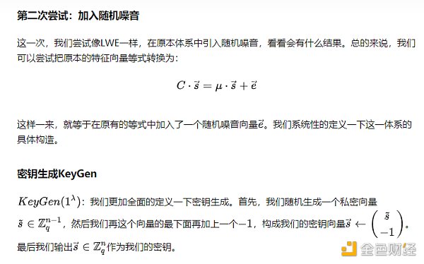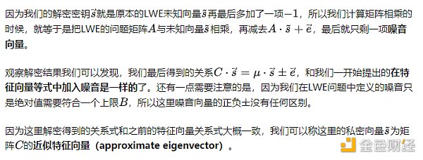 但是这一架构对于我们后续的尝试是一个很好的启发,我们缺哪里补哪里就行了。上一期的文章中,我们讲到高斯消除法可以很好的找到线性方程组的解,但是如果我们叠加了一个噪音的话,就变成了困难的LWE问题。我们这里不妨也做同样的尝试,在特征向量与特征值的等式中加入噪音,看看会不会有所变化。