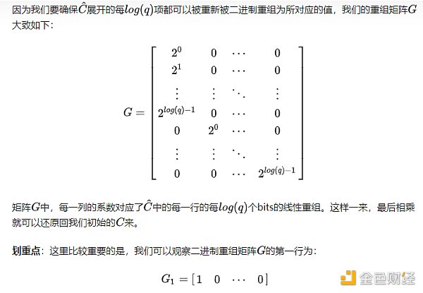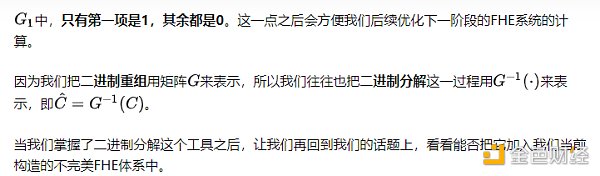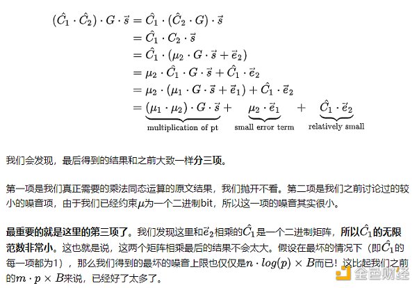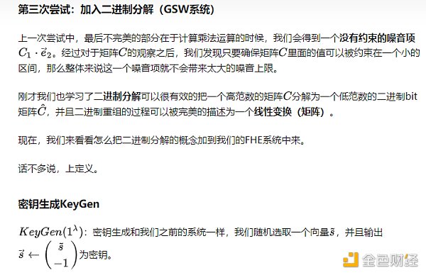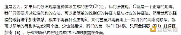 我在文章开头有所提到:GSW系统的精华就在于近似特征向量这么一个定义。我们从普通的特征向量出发构建了一个全同态、但是不加密的系统;随后,我们加入了LWE问题中类似的噪音向量,构成了一个部分同态、但加密的系统。最后,我们使用二进制分解这么一个工具,构成了GSW中最后提到的有限级数全同态加密系统。