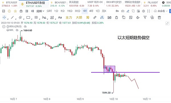 以太早间反弹到阻力位1685附近,这是昨天晚间反弹的高点,个人预计上破1600难度较大,包括跌破1600之后很多散户在1690和1680抄底形成套牢盘,主力思维肯定不会轻易给到获利机会。技术面小时线还没有站稳MA10均线,KDJ在100附近,快线下穿慢线,布林带开口完全朝下运转,空头趋势明显,建议以太在1580上方去空,目标1550,破位1530.