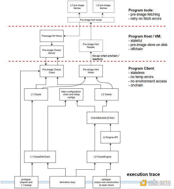 op-program通过PreImageOracle提供的Rollup Inputs的承诺复现L2状态的计算过程,记录execution trace,无状态地验证dispute
