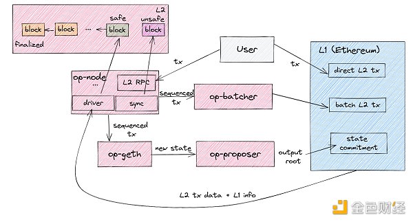 用户提交交易,可以通过L2 RPC在L2上提交,或者在L1上直接提交(可以绕过op-batcher,有更强的抗审查能力,也可作为紧急逃生装置)。