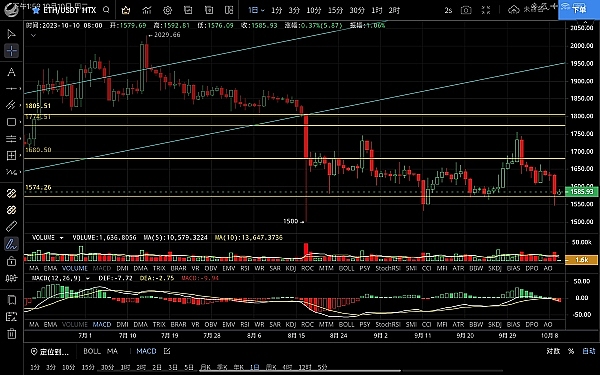 以太坊昨日延续白盘走势继续下跌,空头发力破位前低至1545一线支撑反弹,恭喜跟上昨日思路的朋友,目前币价在1583附近运行,四小时级别k线收长下影走出一波反弹,上方触及ma7均线受阻,macd逐步缩量双线死叉状态,ma7向下指引,短期走势虽有反弹但力度较弱,1600没有突破前依旧保持震荡修复,日线级别行情迅速反弹形成下影线,若收十字星行情多空都有可能,方向上依旧弱势,看空思路不变,上方压制1600-1620,下方支撑1570-1530