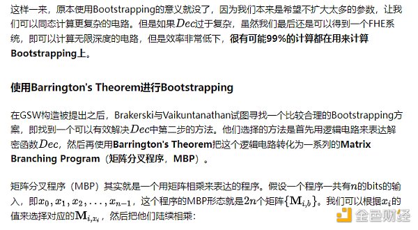 看到这里的朋友们可能会不禁吐槽到,Bootstrapping这么简单的概念,居然需要在电脑上花上半个小时的时间,并且占用这么大的空间才能完成。没错,早期的FHE之所以不能投入应用,就是因为Bootstrapping的开销实在是太大了。并且抛开Bootstrapping不说,我们光是用GSW这样庞大的LWE矩阵来加密一个bit,就基本上代表已经没有什么效率可言了。
