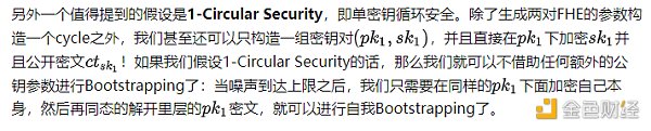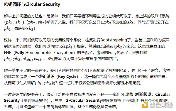但是,我们近几年已经找到了很多反例,即找到了一些一定不满足Circular Security的加密系统。比如说我们手动的在某个加密系统中塞入一个后门,使得一旦拥有了循环密钥,即加密了密钥的密文之后,就可以通过这个后门来获得密钥的原文。但是这些加密系统都是人为的构造的,由于我们目前还没有在现有的公钥加密体系找到一个很自然的反例,所以我们相信Circular Security仍然是个安全的假设。