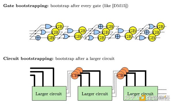 第一种Bootstrapping的策略,就是每当我们进行一次最简单的同态计算,我们就进行一轮的Bootstrapping把噪声值还原到进行计算前的量。因为我们可以把计算的函数用电路表示,而电路的最基本构成元素是逻辑门(Gate),所以这种方案又被称作Gate Bootstrapping。