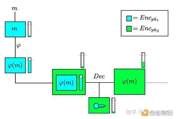 Bob可以通过单向的入口把东西投入手套箱中,但是无法取出任何东西。这代表了我们讨论的FHE加密系统是一个安全的public key(公钥)的加密系统,即任意第三方都可以创造密文但不能解开密文。