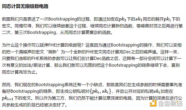 第二种Bootstrapping的思路和我们之前讨论的思路比较相似。我们首先使用原本的FHE系统同态计算我们想要计算的电路,直到达到了噪音临界值。然后我们再进行一轮Bootstrapping来“刷新”噪声值,以便进行后续的同态计算。