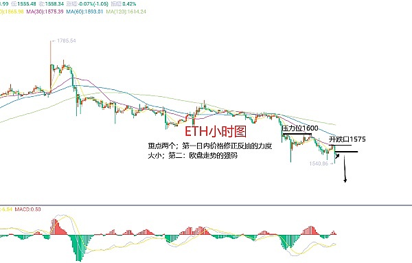 10月11日以太坊(ETH)合约技术面分析:;今日方面,大周期日线级别昨日报收小阴线,K线形态上连阴下跌,价格运行于均线下方,附图指标死叉向下放量运行;在大趋势上下跌还是非常明显的,但还是需要注意两点:第一:今日我们看延续下跌,那么反抽的力度就不能大,否则难跌,这是规律;第二:当前价格有些偏离均线,而回归均线阻力的修正也是需要去关注的,另外欧盘走势的强弱依旧还是重点;短周期小时图早间开跌口在1576区域,当前价格回归均线阻力在1565区域附近,这样来看就简单了,因此今日ETH短线合约交易策略:反抽1565区域空,止损1580区域,目标看1530-1515区域