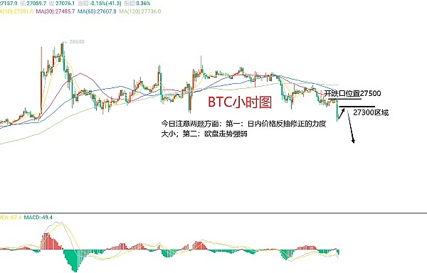 10月11日比特币(BTC)合约技术面分析:今日方面,大周期日线级别昨日报收小阴线,K线形态上连阴下跌,价格也是有效的破位前期的低点位置,附图指标快慢线粘合死叉向下,那么在大趋势就比较明显了;但提示大家还是不能盲目去做,这个东西看着很明显,但不是绝对的,变化无常的。短周期小时图走势非常规律,前一日早间下跌,日内修正后欧盘向下破位,今日凌晨以及早间二次修正后当前下跌,这样来说日内还是会以修正为主,当前也不是极弱,开跌口位置在27500区域附近,今日看延续还是老规矩,反抽力度不能大且不能破开跌口位置,否则震荡,所以还是要等反抽修正后再空,因此今日BTC短线合约交易策略:反抽27300区域空,止损27500区域,目标看26800区域;
