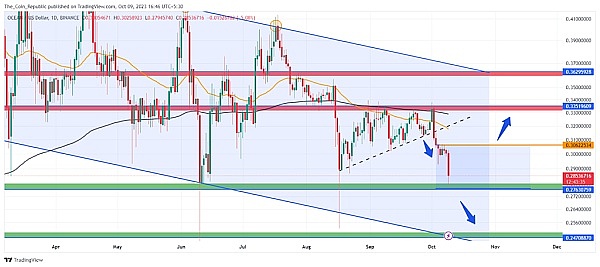价格趋势表明,自 2 月最后一周以来,加密货币价格一直在经历长期调整阶段,并详细描述了形成日线图下降通道模式的过程。在过去的 7 个月中,Ocean 加密货币价格一直遵循该通道,累计下跌近 38%。