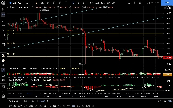 以太坊昨日破位前低后走出一波反弹,但未能延续,高位触及1578一线承压回落,低位跌至1548一线,恭喜跟上昨日思路的朋友空单获利30点,目前币价在1560附近运行,四小时级别行情整体呈震荡走势且空间逐步变窄,macd空头完成缩量双线粘合有金叉迹象,但行情反弹力度不强,上方受ma14均线压制,短期有回落风险,日线级别走势比大饼强势,下方多次试探都没有破位,形成双底结构,macd仍是空头运行双线死叉向下,目前多空博弈,从整体走势而言向下破位的概率较大,思路上建议反弹高空为主低多为辅,上方压制1570-1600,下方支撑1540-1500
