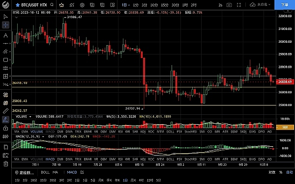 大饼昨日走势与思路一致,破位27000关口后走出一波反弹,触及27320附近阻力再次回落,低位跌至26540一线,恭喜跟上昨日思路的朋友空单获利700点,目前币价在26850附近运行,四小时级别行情暂时止跌反弹,k线收长下影,底部逐渐抬高,macd空头逐步放量,短期行情有反弹需求,27000不破有再次回落的风险,日线级别macd多头转空双线死叉向下,但目前空头没有延续下跌,预计会走一波震荡修正,大饼整体走势比以太要弱,空头依旧占据优势,日线27200已经失守,若26500破位下个位置关注25200最关键的位置,所以再次破位将迎来大瀑布目标是22000和2w关口,整体思路建议反弹高空最稳,上方压制27000-27300,下方支撑26500-26000
