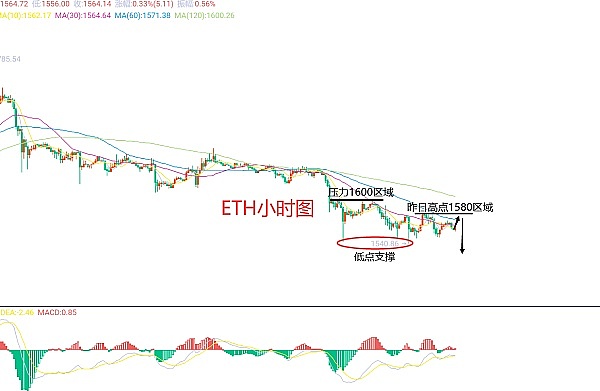 10月12日以太坊(ETH)合约技术面分析:今日方面,大周期日线级别昨日报收小阴线,K线形态上连阴下跌,附图指标死叉向下放量运行,但整体价格波动不大,延续性不强,趋势是比较明显的,所以操作上还是要保持短线同时也要注意来自消息面的影响;短周期小时图昨日欧盘价格下跌但没有向下破位,凌晨支撑反弹修复,当前K线形态连阳,附图指标金叉运行,这样来说日内还是有反抽修复的需求,那么就不能激进了,还是等反抽再空,前期压力位1600区域附近,昨日高点1580区域附近,因此今日ETH短线合约交易策略:反抽1580区域附近空,止损1601区域,目标看1550-1540区域;