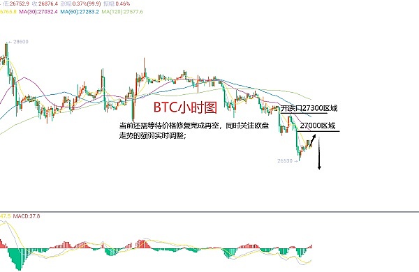 10月12日比特币(BTC)合约技术面分析:今日方面,大周期日线级别昨日报收中阴线,K线形态上连阴下跌,价格连续向下破位,虽说力度不大,但是趋势还是非常明显的,附图指标快慢线粘合死叉向下放量运行,那么在大趋势上就是很明显的,要注意的就是消息面的影响,所以做好风险控制基本没什么问题;短周期小时图昨日欧盘下跌,美盘延续,凌晨在低点支撑后反弹修复,开跌口位置在27300区域附近,今日看延续下跌的话还是老规律,反抽力度不能大,否则难跌,当前价格还有修复的需求,因此今日BTC短线合约交易策略:反抽27000区域空,止损27350区域,目标看26500-26400区域;