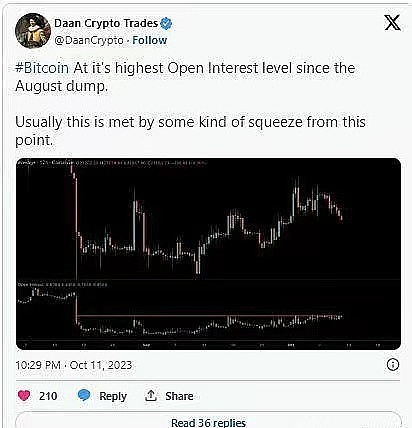 与此同时,另一位交易员 Daan Crypto Trades 指出,未平仓合约数量创下数月新高,高水平引发了本月第一周的波动。
