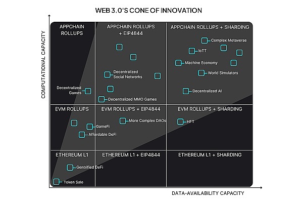 图表上的浅灰色区域是我们可以称之为Web3创新锥形图。随着在两个维度上的扩展进展,更复杂的dApp变得可能。相比之下,锥形图外的深色区域展示了当数据可用性和计算能力不能同步扩展时会发生的情况。