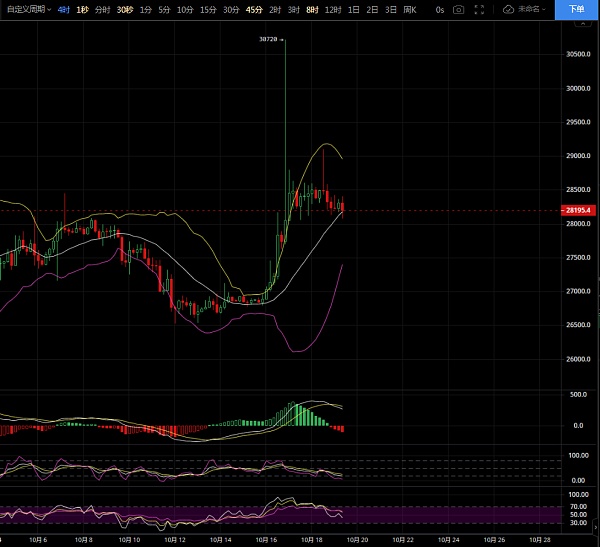 咱们看4小时线图,目前布林带整体看起来还是偏上,只是币价开始慢慢的下降,今早开盘也未给币价带来波动,一直还是维持在28200附近震荡。布林带开始收口,也是跟着时间节点较为吻合,收口也就意味着行情难有大的波幅,MACD双线也是在交叉后开始了向下拉,后续走势还是会维持一个震荡。周一放量太严重,导致本周后几天行情出现横盘也是合情合理,行情当前还是属于修复中,在看KDJ就可以看出,上一下就会下一下,一直都是属于上下跳动中,并没有出现然后的单边走势。个人认为以28000为防守位置,短线高位修正阶段,行情依旧是偏多节奏之中,昨日几波行情也都是围绕在布林中轨上方运行,晚间回踩此处也是牢牢守住,四小时阴转阳短线基本算是企稳,今日只要不下行去试探28000那么整理完毕大概率会继续向下,操作上逢低做多,做单多点耐心。