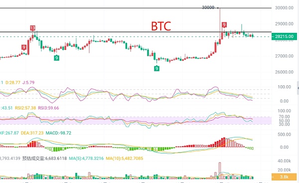 昨日的比特币行情最高上探到29100附近,但回程力度不大,我们看好反弹。从日线图来看,行情依然维持着震荡状态,还未出现明显的趋势。MACD双线持续上扬,并未出现拐头迹象,多头势态强劲。再看四小时布林带,即将出现缩口行情,行情一直在中轨上方震荡运行。目前的准备都是为了下一轮的拉升,但是拉升需要时间,需要静待时机。
