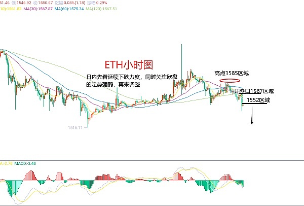 10月19日,以太坊的大周期日线级别昨日报收小阴线,K线形态上连阴单阳,价格在均线下方,附图指标死叉运行,但动能目前没有出现放量的走势,而整体价格还是在区间之内震荡,昨日冲高后回落,没有破高点,也没有延续,那么可见反弹的力度不大,延续不好。短周期小时图当前中阴线下跌,K线形态连阴,附图指标死叉向下且价格破位前一日的低点位置,开跌口位置1567区域,今日看延续下跌破位的话,那么反抽的力度就不能大且欧盘要延续,因此今日ETH短线合约交易策略:现价1552区域直接空,止损1570区域,目标看1520-1515区域。