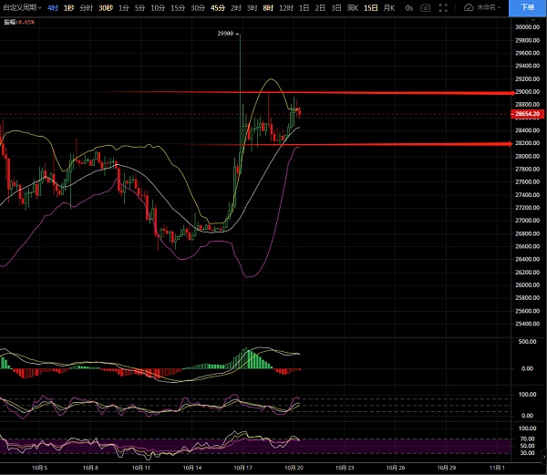 昨日震荡了一天,行情还是走出了小幅的上扬,早就说过,这种区间震荡走势,昨日文章分析也说了,下方28000关口支撑不破依旧是主多参与,行情的波幅虽然小,但好在也是属于拿利状态,目前行情暂且不考虑单边的节奏,比特币在小幅度下探后币价最低跌至28103一线,随后便反弹一路震荡上行直至晚间币价最高来到了28943一线后便开始了承压回落,目前行情则在28600附近震荡运行中。咱们看看今日盘面走势情况。