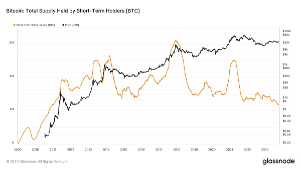 根据数据,目前约有12%的比特币在短期持有者手中。这些持有者对市场波动做出反应最快,他们的行为对比特币的价格走势产生了更大的影响。同时,长期持有者在价格波动期间保持不动。