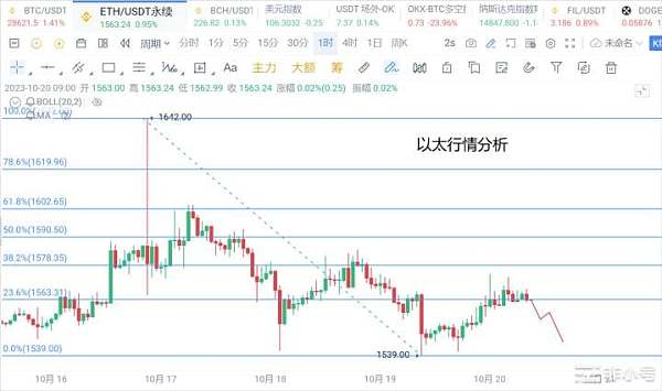 以太在晚间上涨至1570上方,整体趋势看起来非常强劲。在5分钟图上,以太持续在MA450均线上方盘整,而小时线则呈横向运动态势。然而,高点逐渐走低且没有突破前高的迹象。此外,小时线MACD指标出现死叉,多头量能也出现减弱,KDJ指标死叉且向下发散,短期行情显示出调整需求。因此,建议在以太1565-1570区间进行空仓操作,目标设定在1540-1530区间。