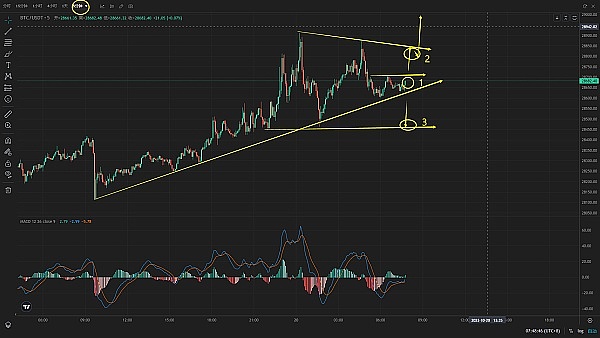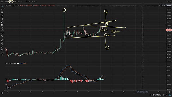 根据小时图分析,当前行情处于日线阻力位置(1处)。此时行情的进一步走势取决于当前形态。如果底部形态已经足够低,未来可能会守候做空单的位置,有效变盘目标位置为27312。若行情上涨突破上轨,需要注意29160左右的阻力,行情可能会休整后再次突破,继续向上探顶。在此情况下,我们可以进行做多操作,并在山鬼探顶的32000左右的区域寻找机会做空,具体操作还需进一步观察分钟级别的行情。