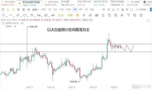 昨天,以太价格出现快速拉升,晚间和早盘市场都处于横盘状态。多头趋势出现减弱的迹象,小时K线跌破了布林带中轨,KDJ指标形成死叉,均线呈现散乱排放的趋势。因此,以太价格在短期内呈现偏空的走势。建议以高空仓位为主,空仓点位为1605-1610,目标位置设定在1680附近。