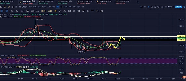 根据当前市场情况,多头可以观察到ETH在1650附近存在压力。此时可以选择埋伏空单操作,将止盈设定在1608,止损设定在1670。