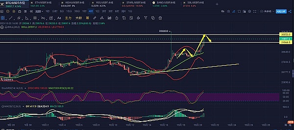 根据当前市场情况,多头可以观察到BTC在30350水平上受到压制。此时可以选择埋伏一波空头操作,将止盈设定在29600,止损设定在30600。