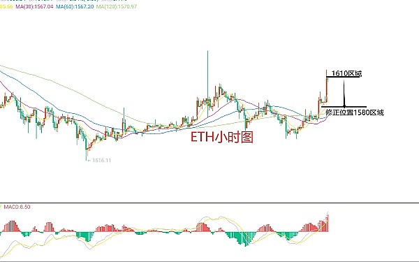今日方面,大周期日线级别昨日报收中阳线,K线形态上出现连阳上涨,价格运行到了均线上方,在早间的价格强势上涨破高后带动附图指标快慢线粘合金叉运行,而前期插针的高点位置在1645区域附近,想破高还是有难度的,毕竟每天的波动有限;短周期小时图早间上涨欧盘延续,但破位前期的高点位置概率不大,当前K线形态连阳,附图指标金叉有些超量了,所以不能多,要尝试去空了,这样的情况多容易挂山顶;因此今日ETH短线合约交易策略:现价1610区域直接空,止损1625区域,目标看1585-1570区域