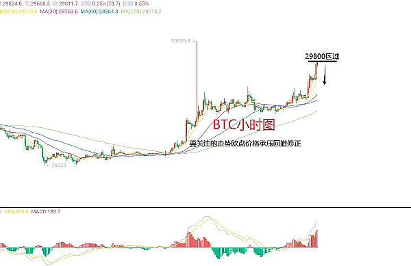 今日方面,大周期日线级别昨日报收中阳线,K线形态上连阳上涨,价格在均线上方,附图指标金叉放量运行,且在早间价格强势上涨破位前一日的高点位置,而到当前欧盘时间价格也没有出现回撤修正的走势,所以不能盲目的直接追多,毕竟上方的空间看不到了,每天的波动也是有限的;短周期小时图当前K线形态连阳,附图指标金叉运行,走势还是比较强,但时间不对,今天周五,大概率是震荡走势,所以晚间我们要空不能多了,因此今日BTC短线合约交易策略:现价29800区域直接空,止损30050区域,目标看29500-29300区域;