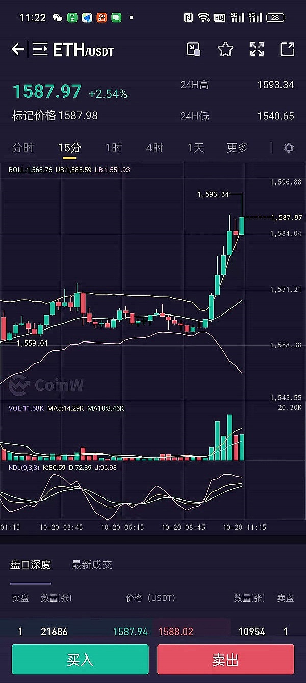 恭喜,昨晚全网直播,eth在最低点1553布局的多单完美止盈,目前最高点到达1593了,大家跟我布局的多单全部止盈40个点离场,100手操作盈利4000U,给力!