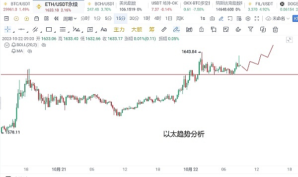 以太周末快速拉升,并且站稳1600一线,多头趋势很强,早间最低回踩1625,随后开始拉高,白盘预计行情不会走出太大的单边,但是趋势上还是多头,日线收出两连阳。小时线K线图走出第二浪拉升,KDJ酝酿金叉,MACD开口往上,建议以太1630附近多,目标1650—1660.