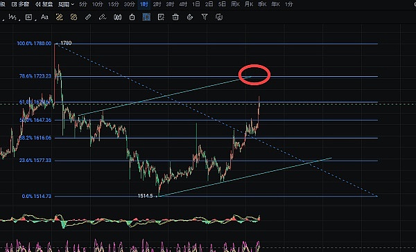 以太坊反抽底部再次抬高,前压1620破位之后支撑形成有效转换,今天周一早盘再次发力,价格快拉80上方一度逼近1700关口。目前小时图来看,币价反复走快拉慢踩的强势格局,下方支撑高点不断上移,BOLL通道扩张凝重,但附图金叉超买之后反持续增量,趋势依旧偏多,今日操作上,李隆建议维持昨日不变,上方屡屡破位破局在即,回踩顺势多进去即可,进场切记做好分批风控计划。